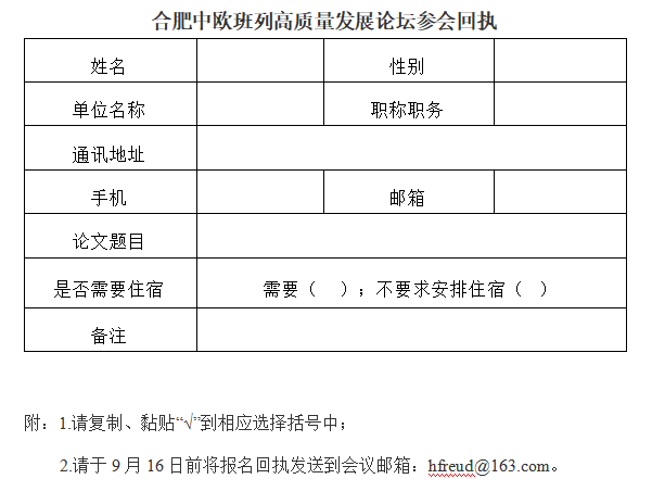 報名、投稿郵件主題務必注明“合肥中歐班列高質量發(fā)展論壇征文+第一作者(或擬參會人員)姓名”。論文首頁請注明聯(lián)系方式(手機號和電子郵箱)。
