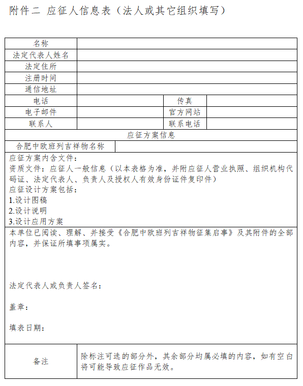 (二)提交方式:作品可以以個人名義或團體名義提交。設計作品的電子版(用word文檔、PDF文件、A4紙排版、附件發(fā)送)和紙質(zhì)版均需注明應征者姓名、單位、通訊地址、郵編、聯(lián)系電話,并填寫應征人信息表(附件一或附件二),簽字后以紙質(zhì)版郵寄。個人作品應提供有效身份證復印件或掃描件,團體作品應提供法人證書、組織機構(gòu)代碼等證件復印件或掃描件(紙質(zhì)版郵寄復印件,電子版以附件形式發(fā)送掃描件)。