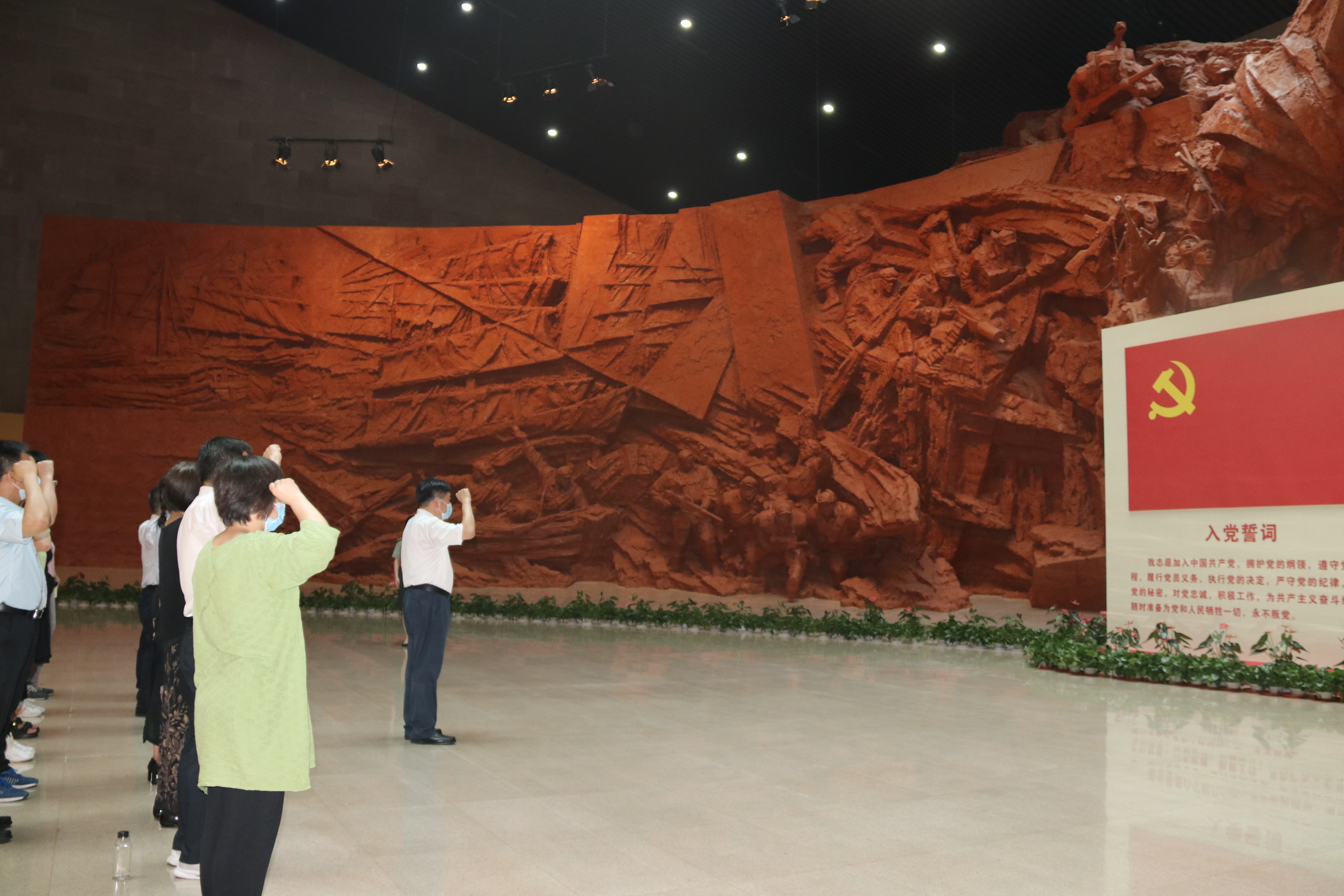 “百年征程篳路藍(lán)縷,百年黨史波瀾壯闊”。渡江戰(zhàn)役紀(jì)念館一樓大廳中,“百萬雄師過大江”雕塑氣勢雄渾,再現(xiàn)了人民的偉大勝利,述說著黨史的光輝篇章。面對(duì)著雕塑前的鮮紅黨旗和入黨誓詞,由朱丹副廳長莊嚴(yán)領(lǐng)誓,全體同志面向黨旗,舉起右拳,重溫入黨誓詞,表達(dá)對(duì)黨無比忠誠和對(duì)革命先烈崇高敬仰。