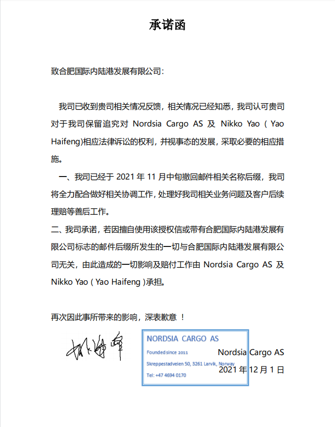 近日,我公司(合肥國際內(nèi)陸港發(fā)展有限公司)收到客戶反饋,Nordsia Cargo AS 及 Nikko Yao ( Yao Haifeng)在未經(jīng)我公司授權的情況下,使用我司logo并涉嫌以我公司名義對外開展經(jīng)濟業(yè)務合作。對此,我公司再次聲明: