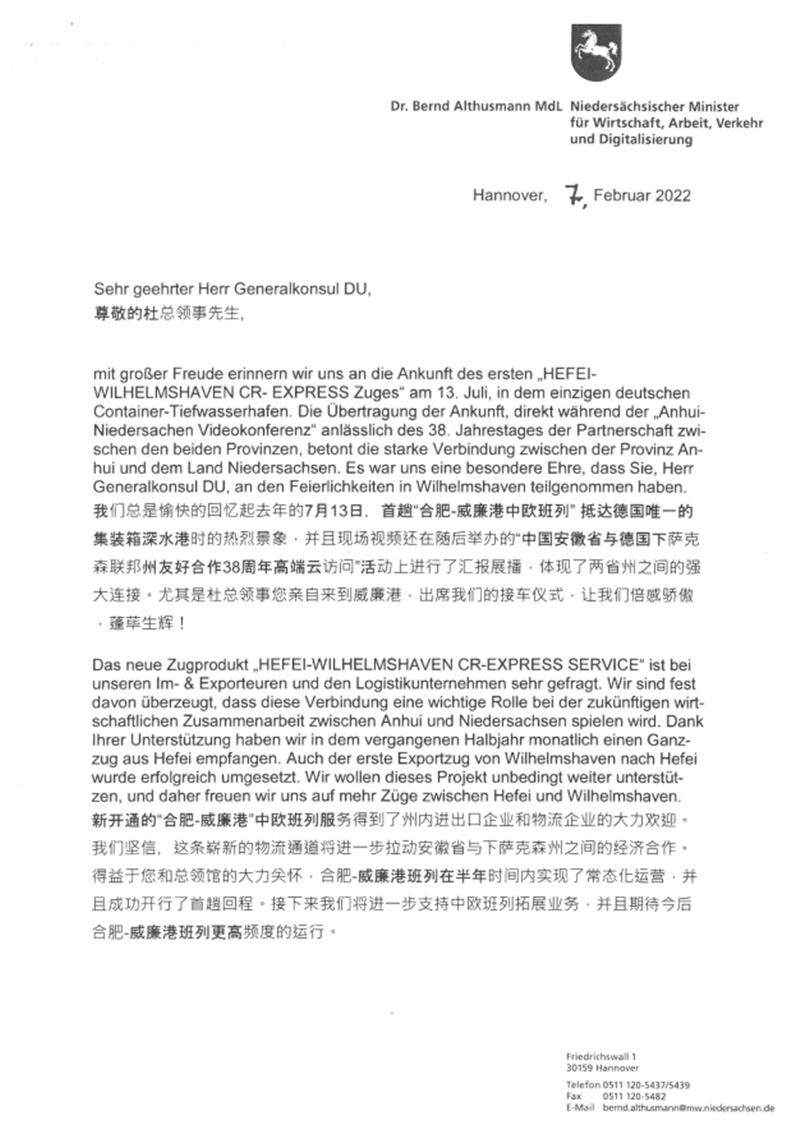 德國(guó)下薩克森州致電駐漢堡領(lǐng)事館對(duì)開(kāi)行“合肥-威廉港”中歐班列表示感謝