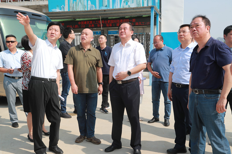 韓冰一行在合肥國際陸港項目現(xiàn)場,聽取合肥國際陸港一期項目建設情況介紹。