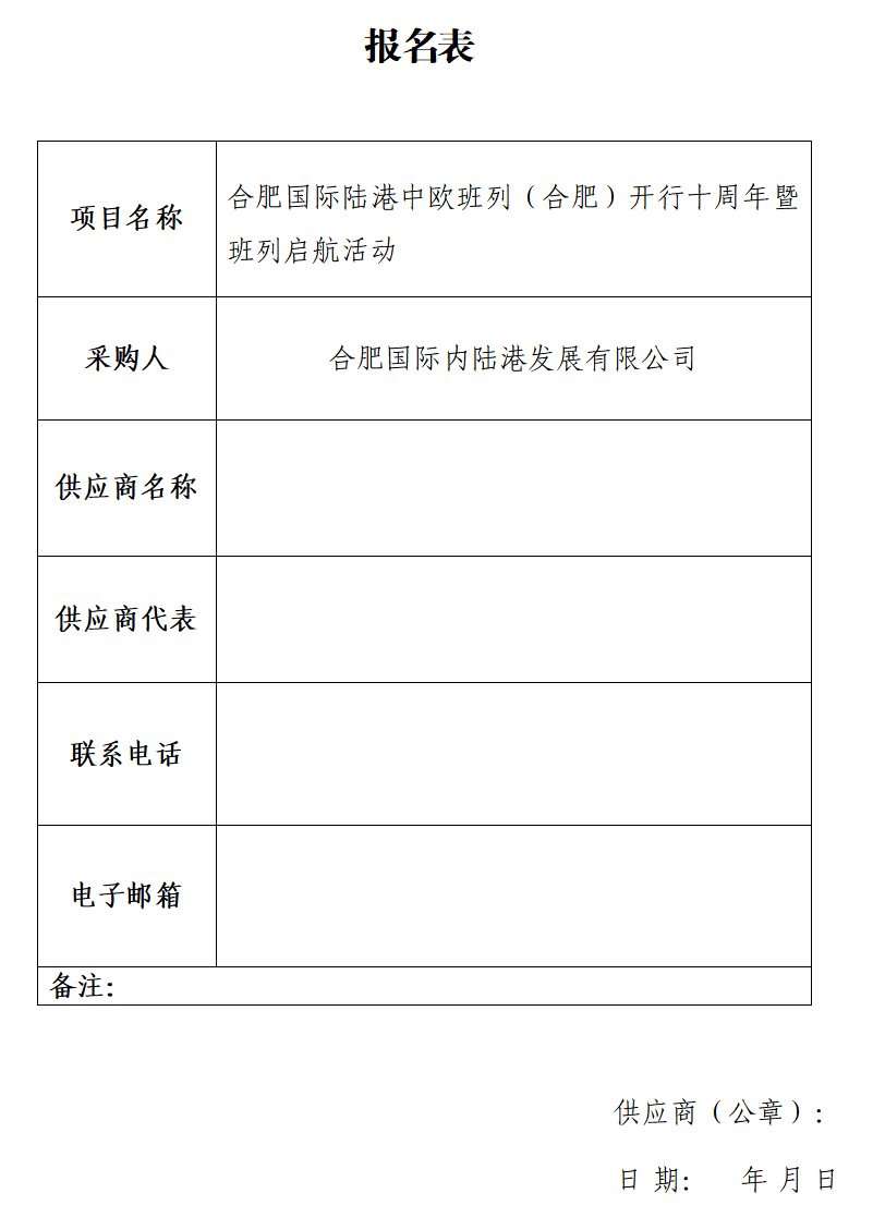 中歐班列作為“一帶一路”倡議的標(biāo)志性成果,得到世界廣泛響應(yīng),中歐班列(合肥)自2014年6月26日首次開通以來,已成為長三角及安徽省十六地市連接亞歐大陸的重要物流通道。合肥國際內(nèi)陸港發(fā)展有限公司擬舉辦中歐班列(合肥)開行十周年暨班列啟航活動,通過本次活動旨在回顧合肥中歐班列過去十年的發(fā)展成就,感謝廣大合作伙伴的支持和信任,同時展望未來發(fā)展藍(lán)圖,提升開放平臺對外影響力和市場競爭力?,F(xiàn)就該活動的方案策劃及舞臺設(shè)計搭建服務(wù)進(jìn)行詢價,歡迎具備條件的供應(yīng)商參加報價。