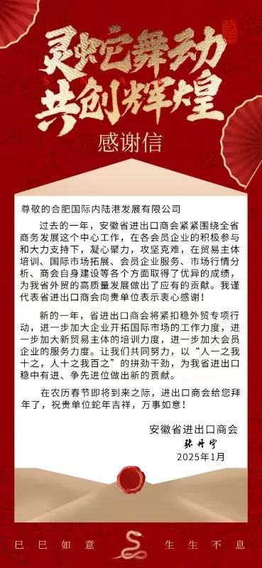 感謝信中特別指出,2024年對(duì)于全省進(jìn)出口行業(yè)而言,是成績(jī)卓著的一年。盡管國(guó)際經(jīng)濟(jì)形勢(shì)依舊復(fù)雜多變,然而安徽省進(jìn)出口商會(huì)在合肥國(guó)際陸港等會(huì)員單位的大力支持下,各類業(yè)務(wù)實(shí)現(xiàn)了重大突破,各項(xiàng)關(guān)鍵指標(biāo)表現(xiàn)亮眼,為我省進(jìn)出口穩(wěn)中有進(jìn)、爭(zhēng)先進(jìn)位做出了新的貢獻(xiàn)。