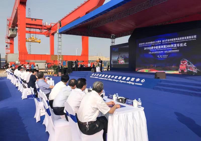 9月27日上午,2019合肥中歐班列第300列發(fā)車儀式在合肥貨運(yùn)中心北站物流基地舉行。省委常委、市委書記宋國權(quán)宣布發(fā)車,市政府副市長朱策致歡迎辭。RTSB集團(tuán)中國區(qū)質(zhì)量管理總監(jiān)卡佳、中國鐵路上海局集團(tuán)有限公司副總經(jīng)理趙麗建、中鐵集裝箱運(yùn)輸有限責(zé)任公司副總經(jīng)理呂忠揚(yáng)、合肥海關(guān)副關(guān)長丁藝宏先后致辭。省政府副秘書長、省政府發(fā)展研究中心主任孫東海、省發(fā)改委副巡視員鄭斌,省自然資源廳黨組成員夏炎,中國郵政集團(tuán)安徽省寄遞事業(yè)部黨委副書記馬俊林,省郵政管理局副局長鮑黎霞,合肥新站高新區(qū)黨工委書記、管委會主任路軍,市政府副秘書長汪維明等出席發(fā)車儀式。市產(chǎn)投集團(tuán)黨委委員、董事、副總經(jīng)理沈校根介紹合肥中歐班列發(fā)展情況,市產(chǎn)投集團(tuán)黨委副書記、董事、總經(jīng)理袁飛主持發(fā)車儀式。