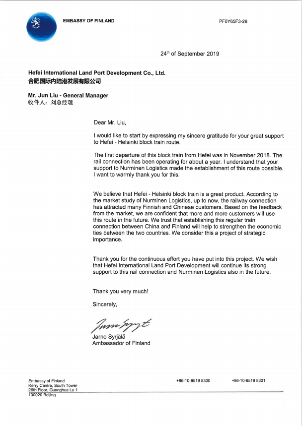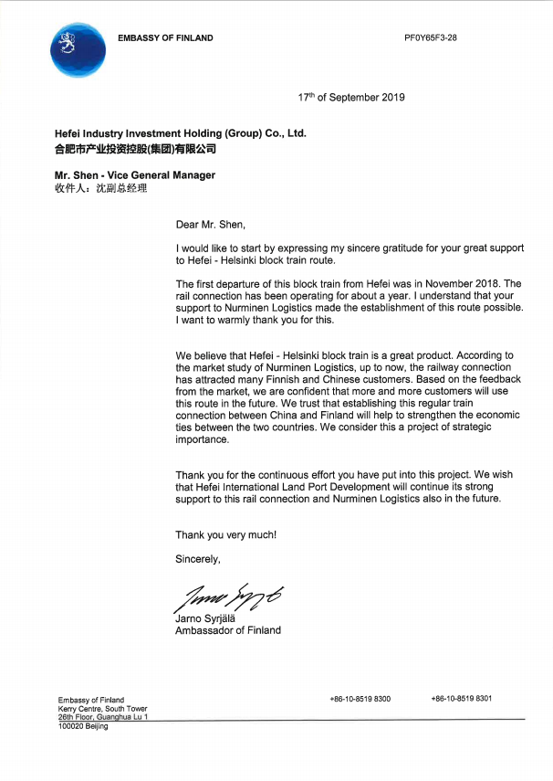 9月17日,芬蘭駐華大使館給合肥國際陸港發(fā)來感謝信,對合肥國際陸港公司負責運營的合肥至芬蘭赫爾辛基中歐班列一年多來取得的成果表示祝賀,同時對合肥產(chǎn)投集團及合肥國際陸港對于該條線路的支持和努力表示感謝。