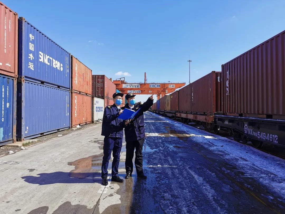 青島海關(guān)關(guān)員在上合示范區(qū)多式聯(lián)運中心監(jiān)管驗放國際班列發(fā)運