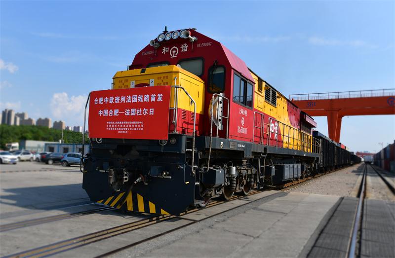9月5日下午15時零8分, 一列滿載美的冰箱、冷柜等“安徽制造”的中歐班列從合肥北站物流基地緩緩駛出,一路向法國杜爾日車站飛馳。此趟班列共計發(fā)運86個TEU,貨重243.87噸,它的成功開行,標志著合肥中歐班列通往法國的新線路、新站點正式開通,進一步促進了長三角地區(qū)與法國在國際貿(mào)易合作上的互聯(lián)、互通、互助、互享,是合肥中歐班列積極落實“六穩(wěn)”“六?!辈渴鹨?,大力推進長三角區(qū)域一體化、高質(zhì)量發(fā)展的最新行動。