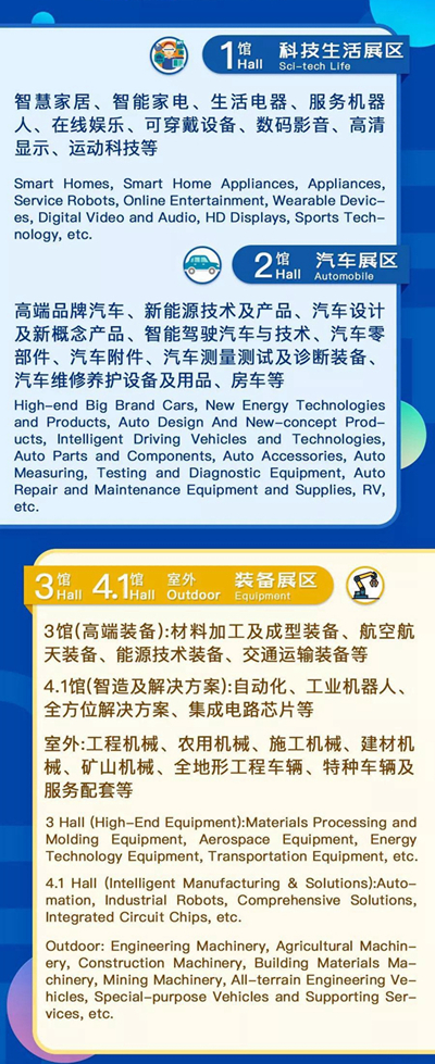 6.1館、6.2館——品質(zhì)生活展區(qū):美妝日化、母嬰用品、體育用品、戶外體育及休閑用品、寵物食品及用品、飾品、玩具、禮品及文創(chuàng)產(chǎn)品、家具及家居用品、服裝服飾及配件、箱包、鞋、珠寶首飾、鐘表、藝術(shù)品等;設(shè)立高端消費(fèi)品展區(qū);