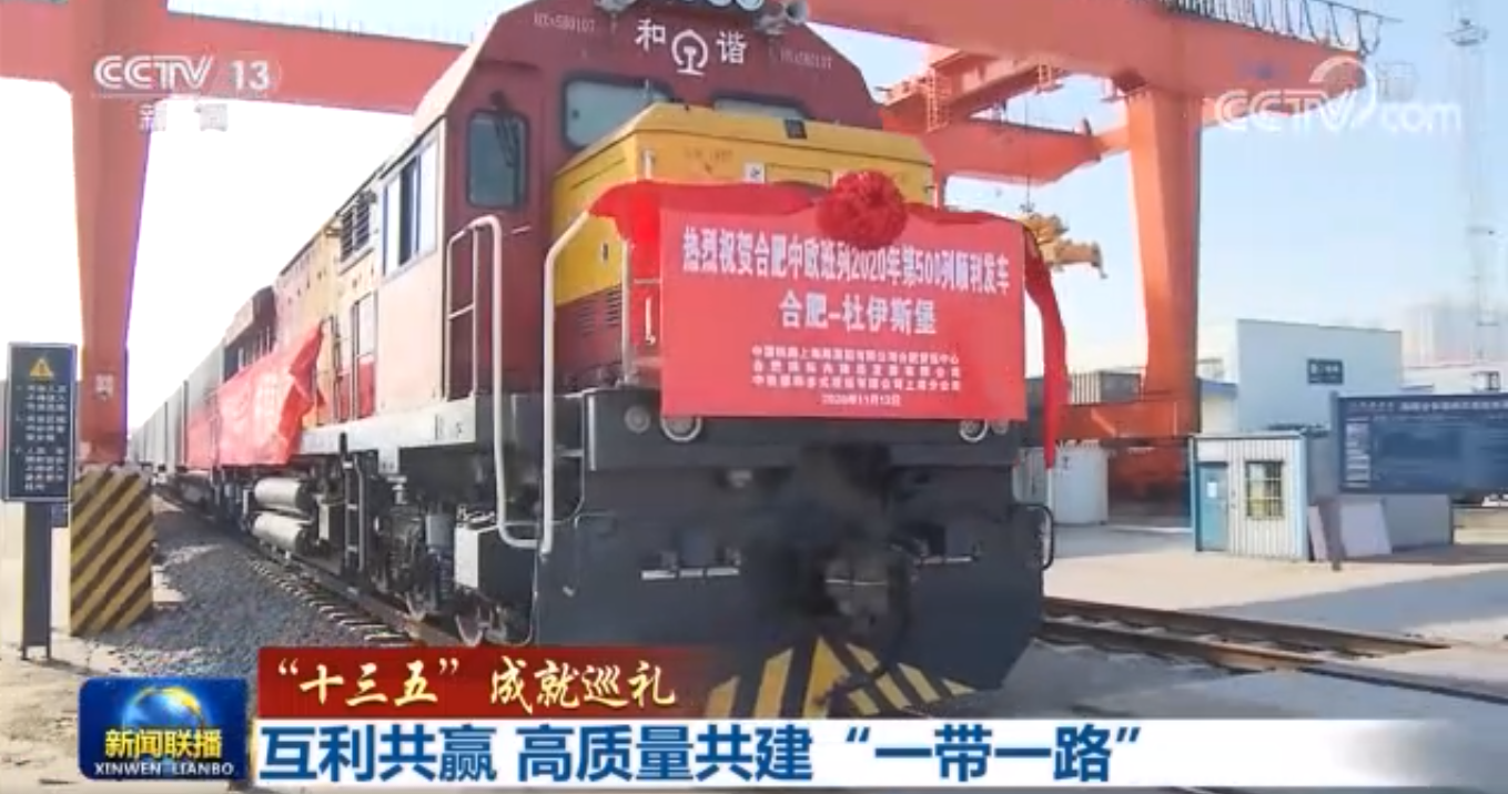 11月21日晚,合肥中歐班列2020年第500列鳴笛發(fā)車的一幕亮相中央電視臺《新聞聯(lián)播》,點贊合肥中歐班列等“鋼鐵駝隊”在“十三五”期間,參與高質(zhì)量共建“一帶一路”,暢通國際物流運(yùn)輸通道,構(gòu)建互利共贏良好發(fā)展格局的突出成就。