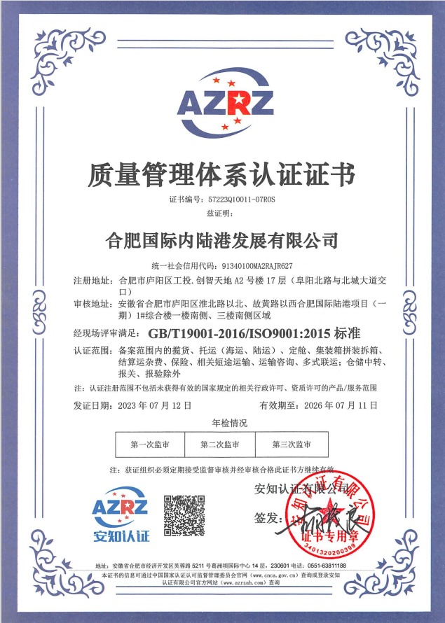 合肥國際陸港順利通過ISO9001國際質(zhì)量管理體系認(rèn)證