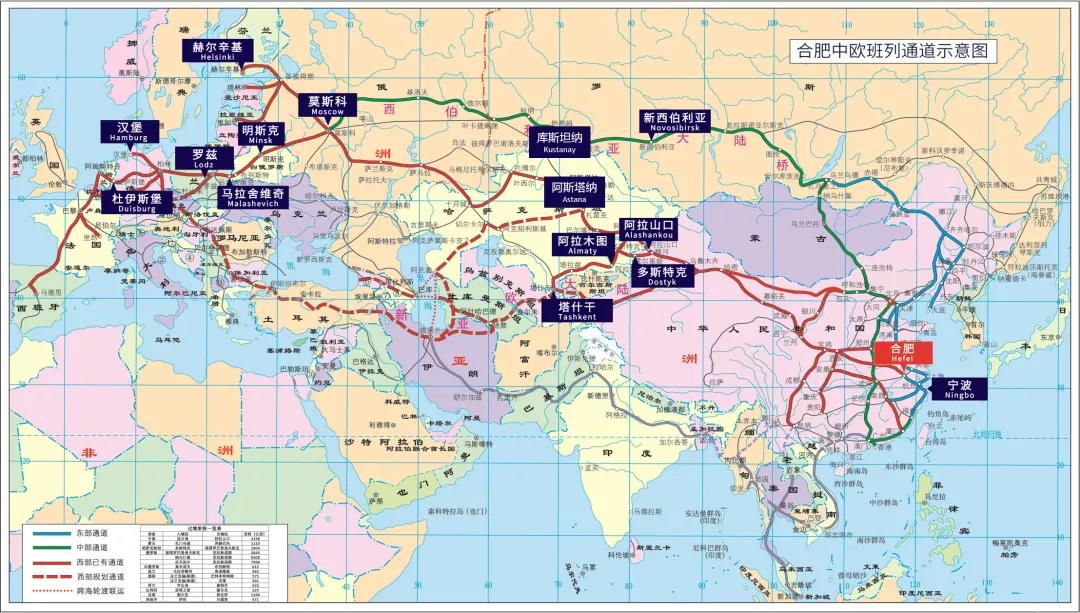 2014年6月26日,合肥市開通至哈薩克斯坦多斯特克的中歐亞洲方向班列,這是安徽省、合肥市歷史上第一列鐵路國際貨運專列。